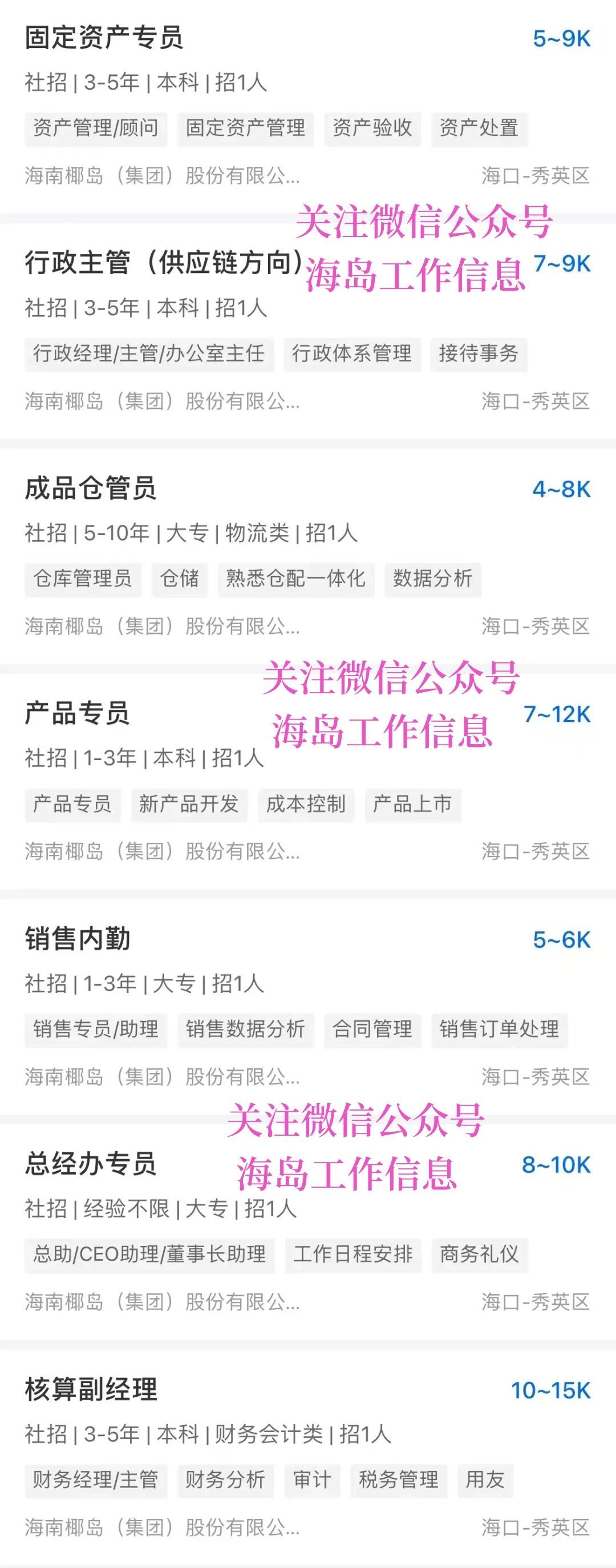 获取海南省招聘信海南椰岛(集团)股份有限公司2024年招聘工作人员 海南椰岛(集团)股份有限公司(以下简称“椰岛集团”)前身为国营海口市酒厂,1953年建厂,1993年完成股份制改制,2000年在上海证券交易所上市(股票代码:600238),是一家以保健酒、白酒产业为核心,涉及食品、饮料、贸易、投资、文旅、地产等多个领域的大型国资实控上市企业集团、国家级高新技术企业,为中国保健酒上市公司。 椰岛集团总部位于中国最大的自由贸易试验区、中国特色自由贸易港核心区海南海口,公司始终秉持 “用制药的标准酿酒”的宗旨,主营产品椰岛鹿龟酒历史悠久,文化底蕴深厚,作为一款严格按照GMP标准生产的保健酒产品,深受消费者喜爱,其酿泡技艺入选海南省非物质文化遗产名录。公司旗下椰岛海王酒、海口大曲、椰岛原浆、椰岛海酱、椰岛粮酱等亦广获赞誉。 建厂70年、上市23年以来,椰岛集团先后荣获国家商标战略实施示范企业、中国驰名商标、中国名牌产品、中国知名滋补保健酒信誉品牌、中国食品工业百强企业、最具影响力的海南知名品牌、海南省著名商标、海南老字号、中华老字号等荣誉100余项。 海南椰岛将与海南自贸港建设同向同行、同心同力,以“传承中华养生智慧,共创健康中国”为使命,坚持大健康产业的发展方向,勇立潮头、谱写新篇,致力于成为世界一流的健康消费品综合运营服务商,缔造百年椰岛。 招聘岗位: