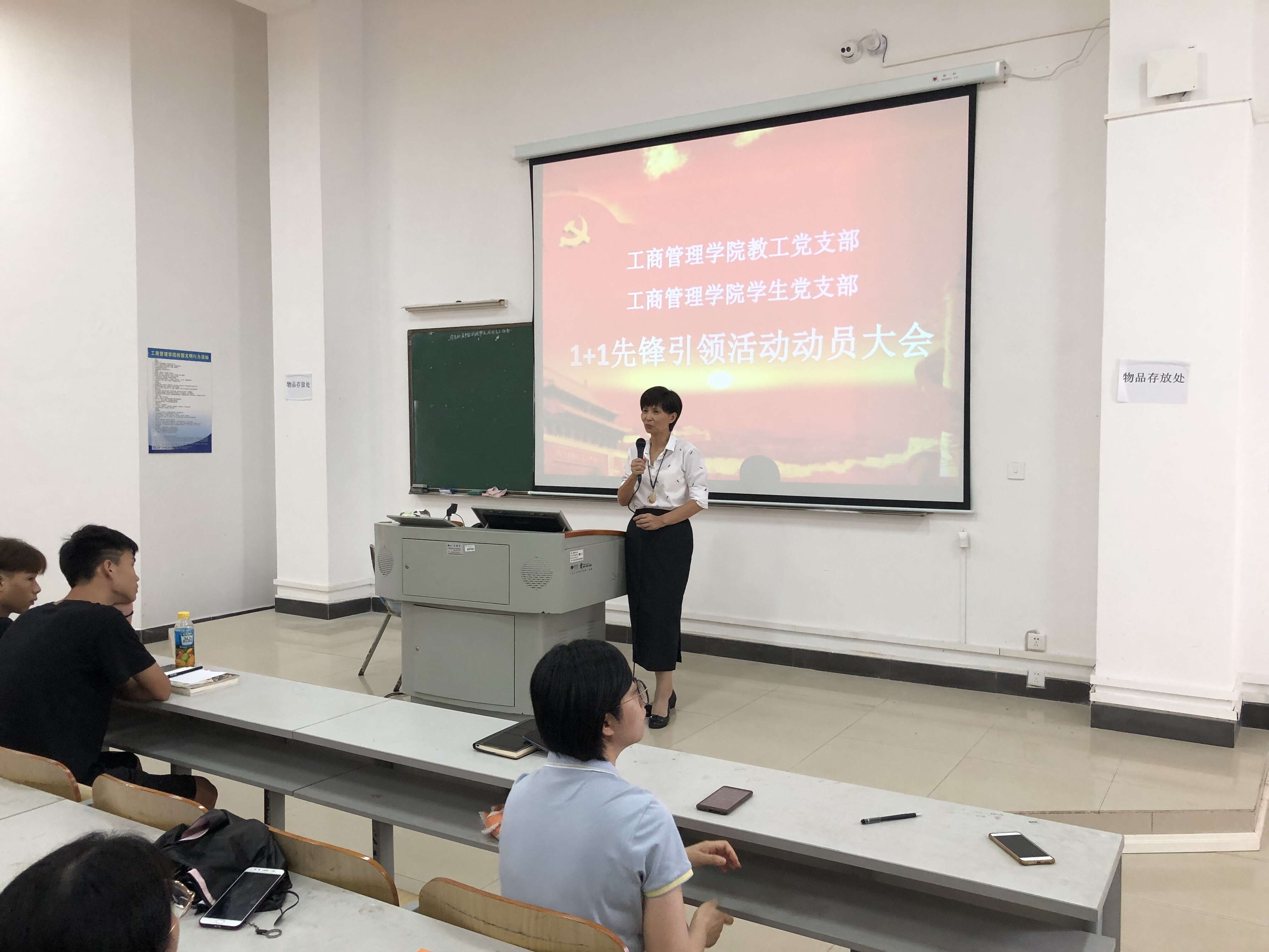 工商管理学院教工党支部及工商管理学院学生党支部于2019年5月30日在1—409开展“1+1先锋引领活动动员大会”,此次会议由学生支部书记印华主持,会议先由党总支书记蒙永坚致辞,会上她强调,入党积极分子要积极与思想导师沟通交流,进一步端正入党动机,找出自身差距,思想和行动上都要与党中央保持一致。其次由教师支部书记赵爽讲话,她强调,每位入党积极分子都肩负着重要使命,希望此项活动能加强入党积极分子与教师党员的沟通交流,端正思想,净化心灵,牢固树立“四个意识”,发挥引领示范作用,为学院的发展做出积极的贡献。最后,学生支部书记印华老师对全体入党积极分子进行了入党知识培训。