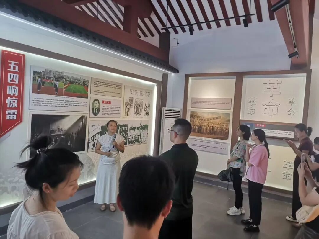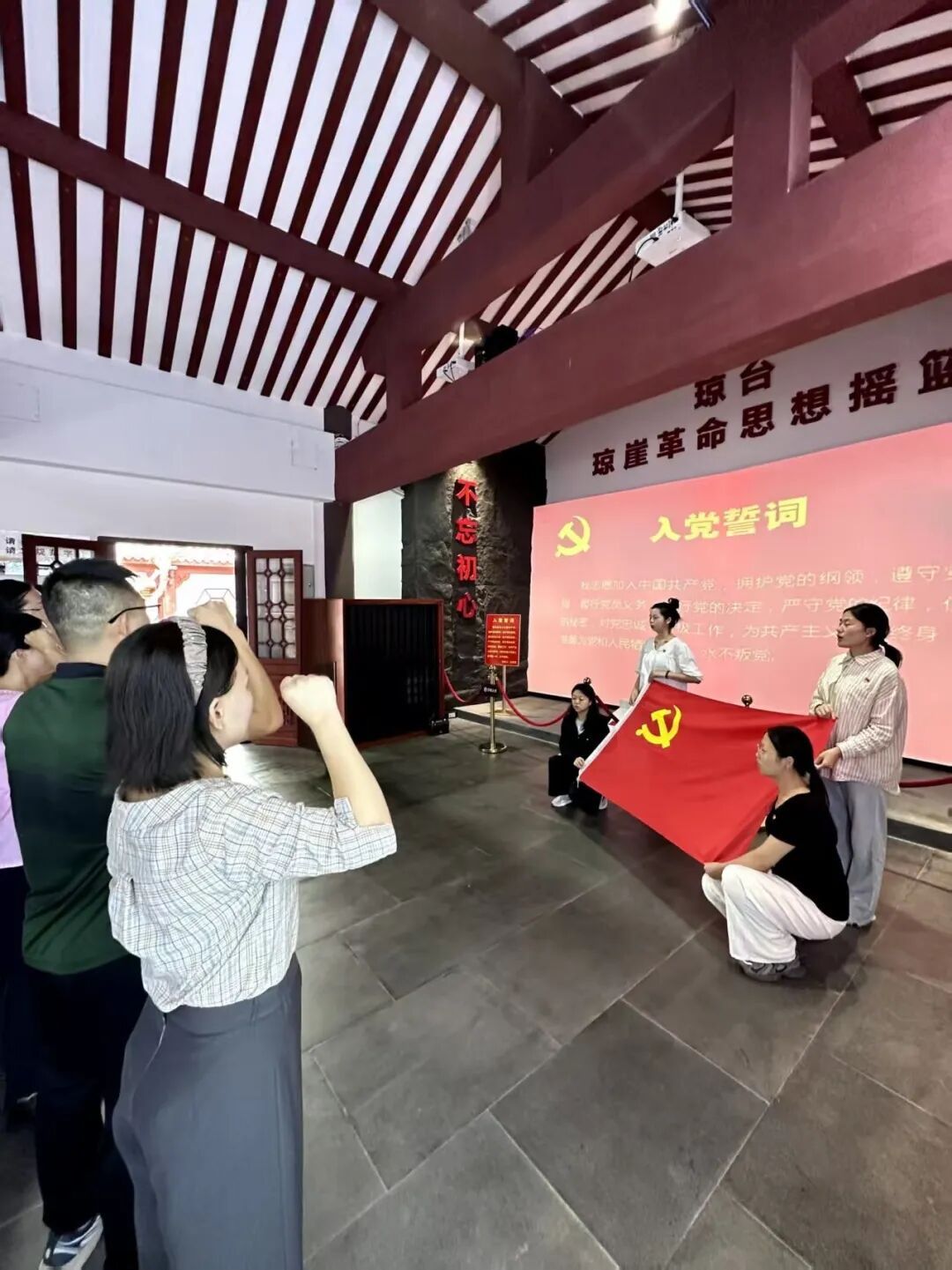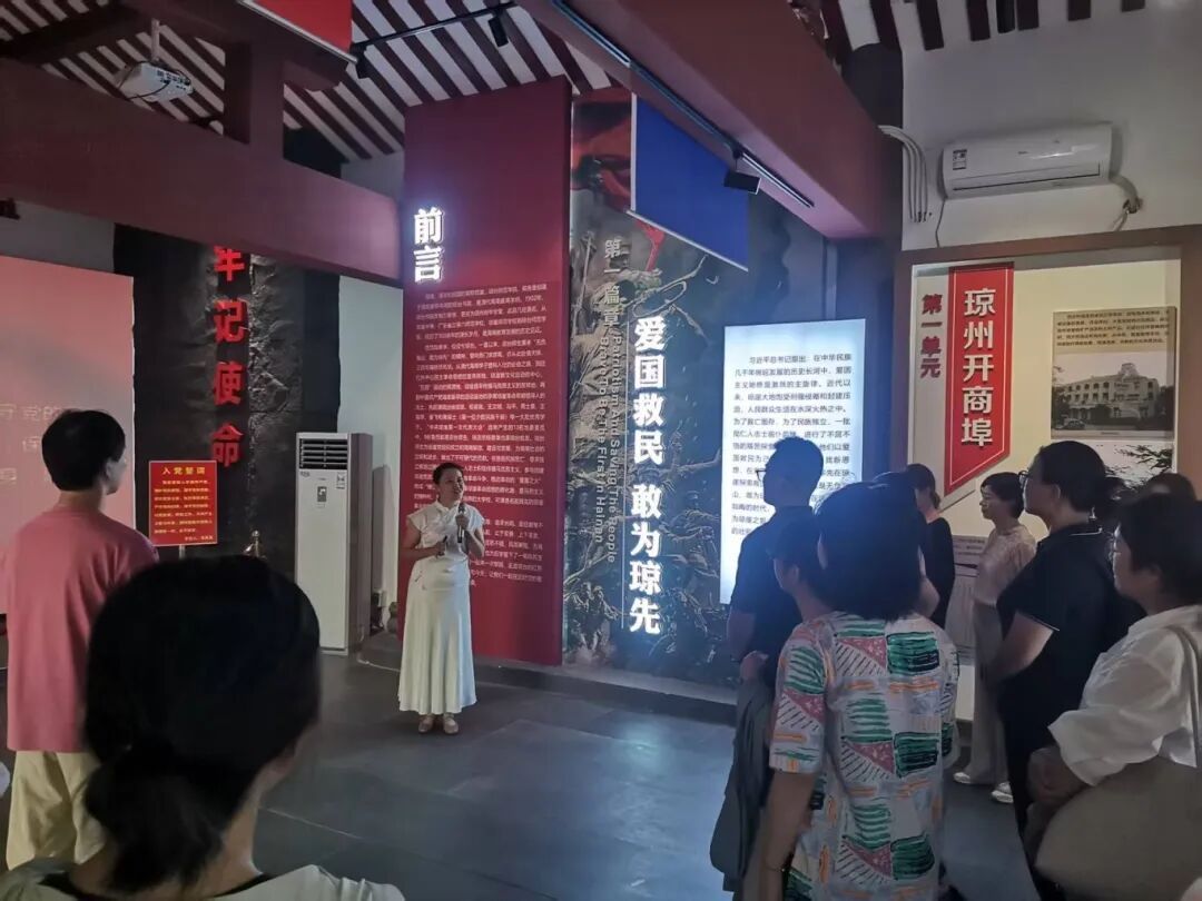 在琼崖革命思想摇篮展馆内,鲜红的党旗高高飘扬,全体党员身着正装,举起右拳、紧握拳头,以庄严肃穆的姿态重温入党誓词。随后,在博物馆馆长杨艳红生动详实的讲解下,大家循着历史的足迹,全面探寻海南琼崖革命先烈们敢为人先、自立自强、英勇无畏的斗争历程,同时深入了解琼州文脉的传承与发展脉络。党员们认真聆听讲解,不时驻足凝视、交流感悟,深刻体会到革命精神中蕴含的 “攻坚克难、勇毅前行” 的核心内涵,这与学校当前推进申本和双高建设所需要的精神品质高度契合,让大家在回望历史中不断汲取干事创业的伟大力量。