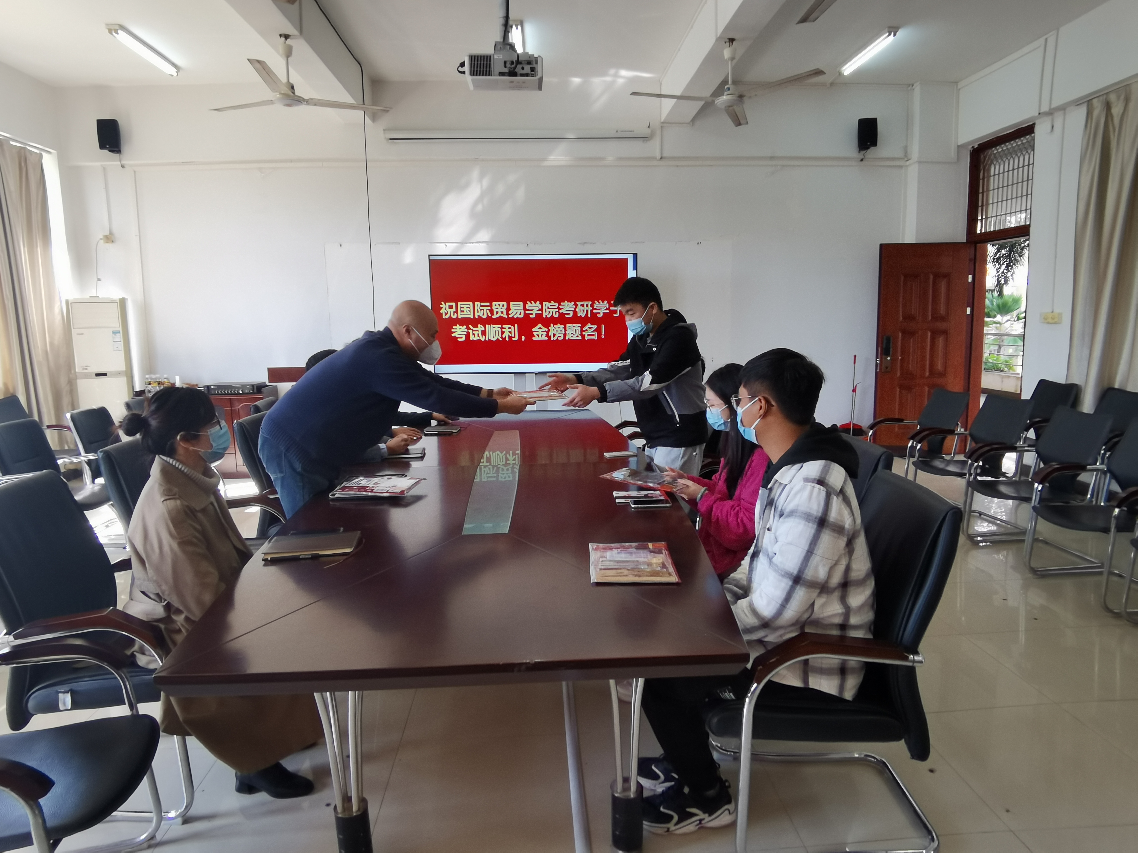 最后,老师们为同学们发放了学院精心准备的考研爱心大礼包,并鼓励同学们安心复习,全力以赴,祝愿我院考研学子最后都能以优异的成绩突出重围,金榜题名!礼包虽小,但这一贴心举动却让备考学子倍感温暖,同学们接过爱心大礼包后,纷纷表示:“在考研冲刺的最后关头,能够收到温暖的祝福,十分感动,一定会全力以赴不留遗憾,不辜负老师和学校的期望,为海经贸添砖加瓦。”