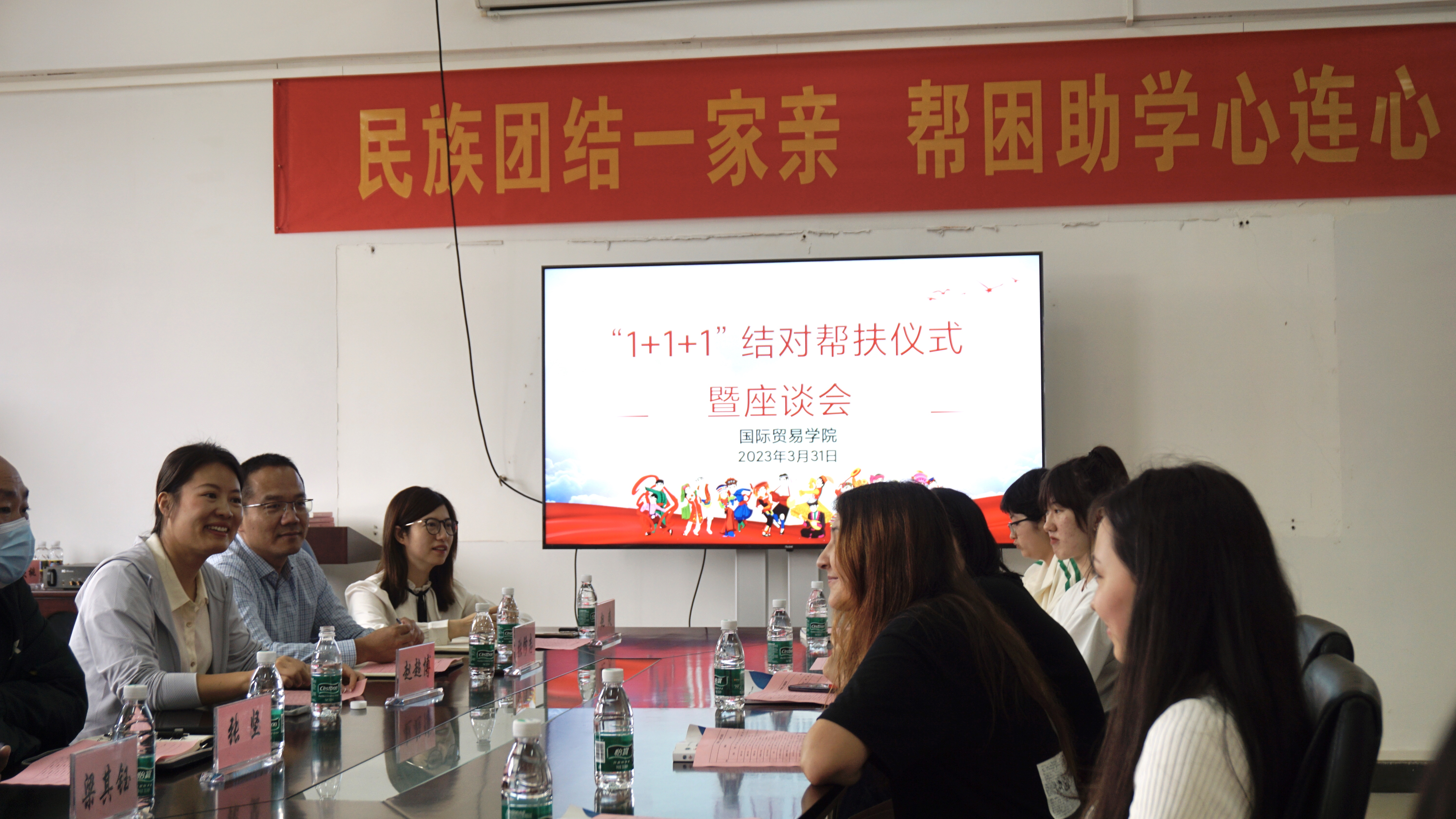 座谈会在轻松愉悦的氛围中拉开序幕。首先,党总支副书记梁其钰介绍了“1+1+1”结对帮扶的活动方案、背景及意义,该项工作通过1名院领导、1名学生干部结对帮扶1名少数民族学生,帮助他们提高语言表达能力、克服学习障碍、摆脱生活困难。会上,少数民族学生代表踊跃发言,畅谈了在校期间的学习和生活情况,交流了目前所面临的困难和困惑,并表示对学院的此项举动深受感动。21级国经1班学生努尔苏力坦·吐尔逊说:“当时不远千里从新疆来到海南,一开始生活上有很多不适应,但老师们的关心和同学们的热情让我慢慢融入了海经贸这个大家庭,在老师和同学们的鼓励下参加了许多社团活动,帮助我更快地成长,我的内心感到非常温暖”。努尔苏力坦的分享引起了在场师生的共鸣,气氛十分热烈。学生干部陈其晓发言,表示将通过帮扶活动增进交流、共同进步。