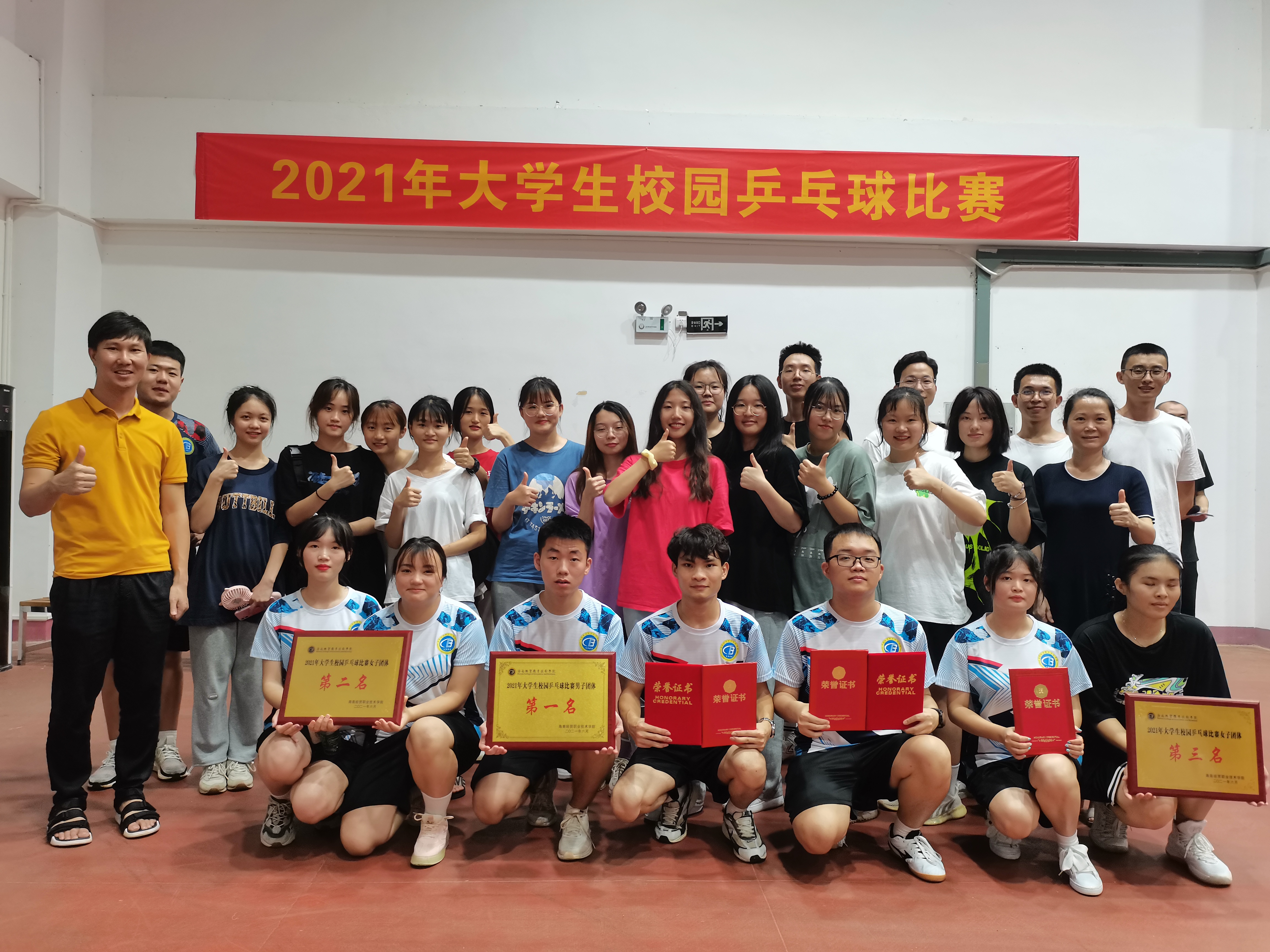 最终我院乒乓球队荣获了男子团体赛第一名,,男子双打第一名,男子单打第一名、第二名,女子团体赛第二名,女子单打第三名的好成绩。我院青年志愿者通过秩序维护、现场氛围的调动、后勤物资的运送,为运动员们提供了周到的后勤保障,得到了在场师生的一致好评,充分展现我院学生积极向上、努力拼搏、团结合作的精神风貌。