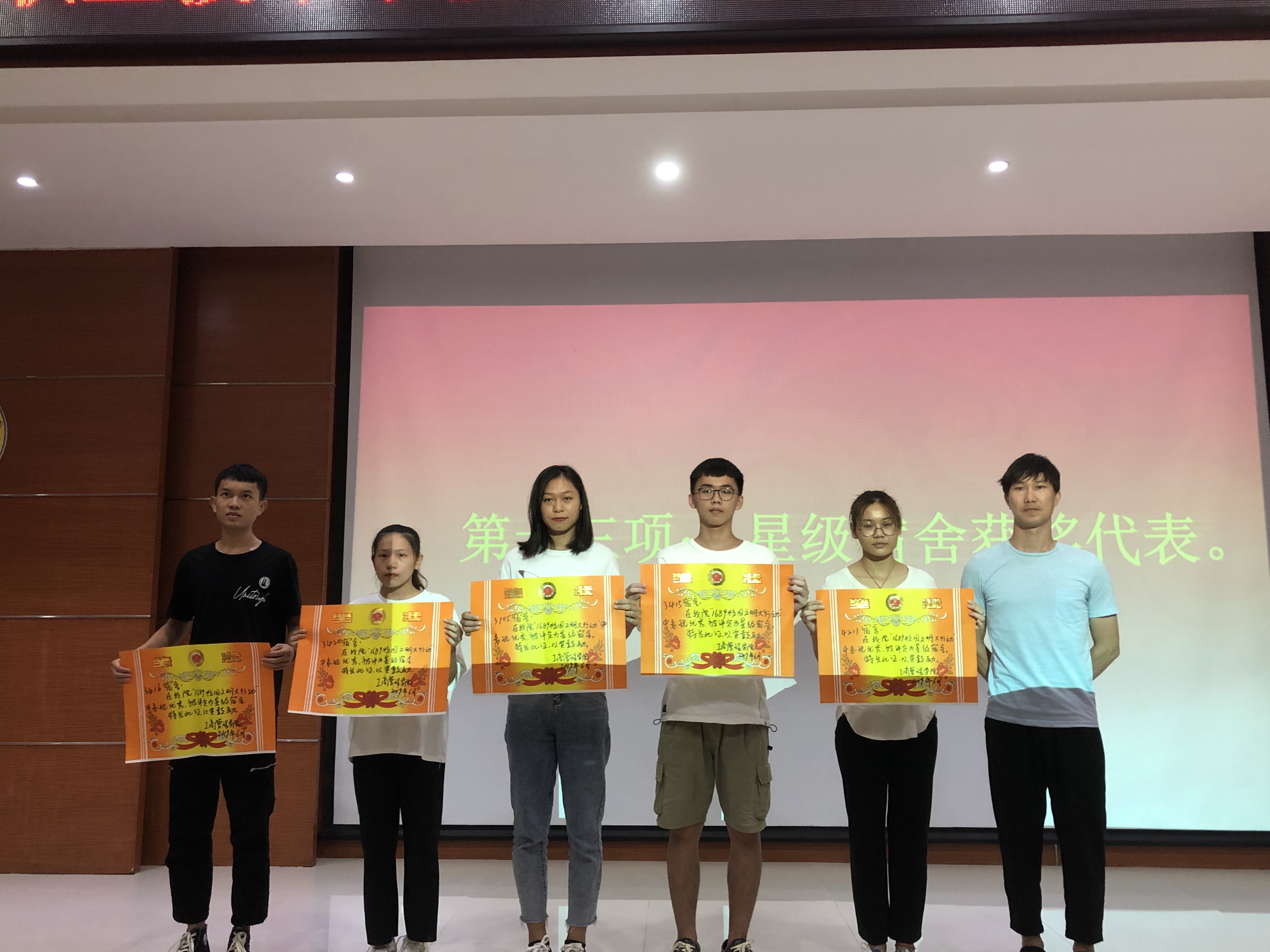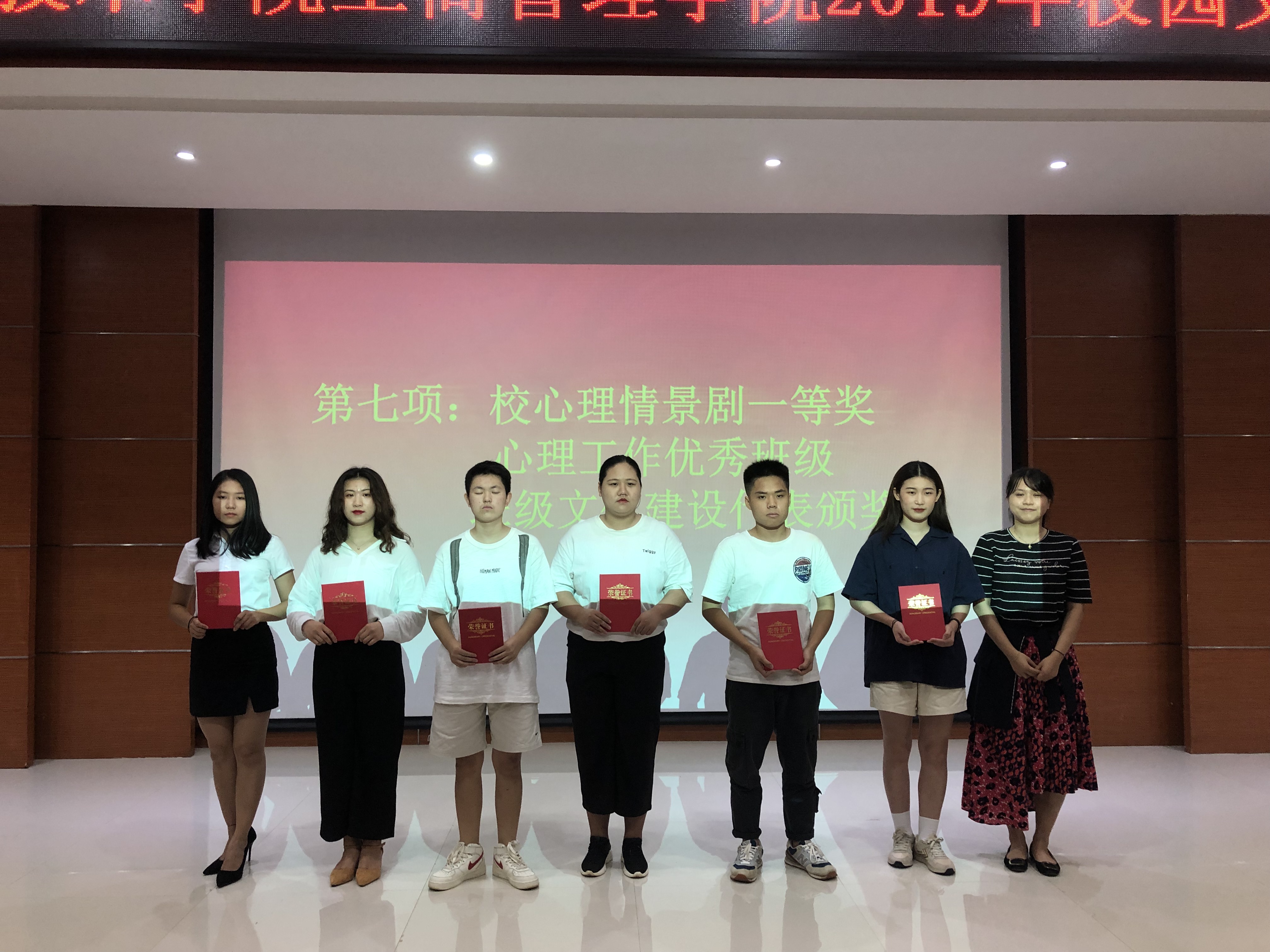 大会在国歌声中拉开帷幕,通过观看学院表彰宣传片,一起重温整学年学院的荣耀时刻,让在场同学们倍感激动与自豪。紧接着学工办主任赵志凌老师宣读表彰决定后,我院领导和团总支负责老师和辅导员分别为军训红歌、礼仪操、心理情景剧、心理工作优秀班级、班级文化建设、辩论赛、五四红歌及优秀团员、优秀团干、先进团支部、星级宿舍、宿管委、学工助理的学生干部和代表、班级文化建设优秀指导老师进行颁奖。