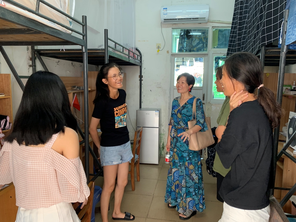 在检查过程中,蒙书记走进学生宿舍,亲切慰问宿舍中的同学,就学生目前在日常生活中遇到的困难进行建议和帮扶。蒙书记强调,同学们在学习和生活中遇到困难,要及时和辅导员、班主任反映,同学们要全身心投入到学习中去。