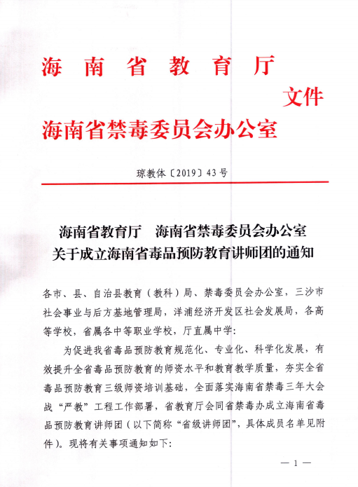 2019年3月18日讯(工商管理学院报道)近日,为全面落实海南省禁毒三年大会战“严教”工程工作部署,海南省教育厅、海南省禁毒委员会办公室联合下文,成立海南省预防教育讲师团,我院辅导员徐翊缤老师入选其中。