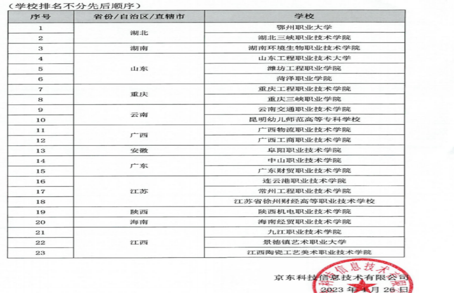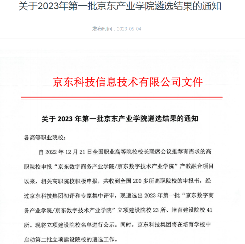 本次共有全国200多所职业院校参加遴选,经京东科技集团初审和专家集中评审,最终从提交申报书高职院校中遴选出2023年第一批“京东数字商务产业学院/京东数字技术产业学院”。其中立项建设院校23所、培育建设院校41所。海经贸入选2023年第一批“京东数字商务产业学院/京东数字技术产业学院”立项建设院校。