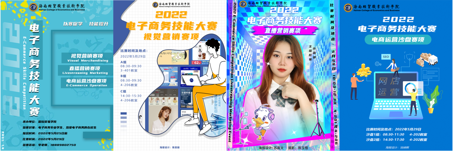 比赛分为三个赛项:视觉营销、电商运营沙盘和直播营销,考察参赛选手数据分析能力、视觉营销能力、营销策划能力、网络营销能力、网店直播营销能力、网店运营能力、供应链管理能力等。比赛前期,各赛项比赛内容海报的主视觉设计均由我院电子商务专业学生完成,也是对这四名电子商务同学设计技能的一个真实项目考核。同时,赛前组织、设备调试、现场引导及志愿服务均由电子商务学生担任,使学生的组织、沟通及协调能力得到锻炼。