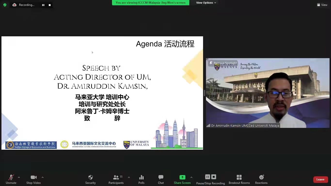 2021年12月15日,海南经贸职业技术学院best365官方网站登录入口、马来亚大学、马来西亚国际文化交流中心共同举办的“学生线上游学研修班”举行开班仪式,开启为期10天的马来文化课程和管理专业课程之旅。