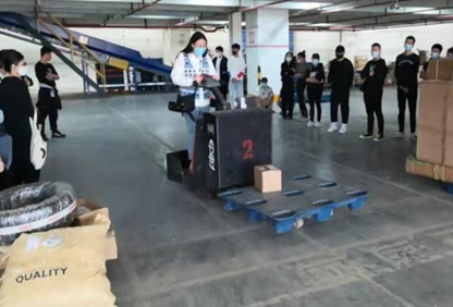 随后吴智经理向同学们展示电动叉车的使用,并让同学们亲自体验。同学们感慨说,看吴老师操作这么熟练,自己一上就紧张的手忙脚乱、叉车不听使唤,真正体会到了“纸上得来终觉浅,绝知此事要躬行”的真正内涵。
