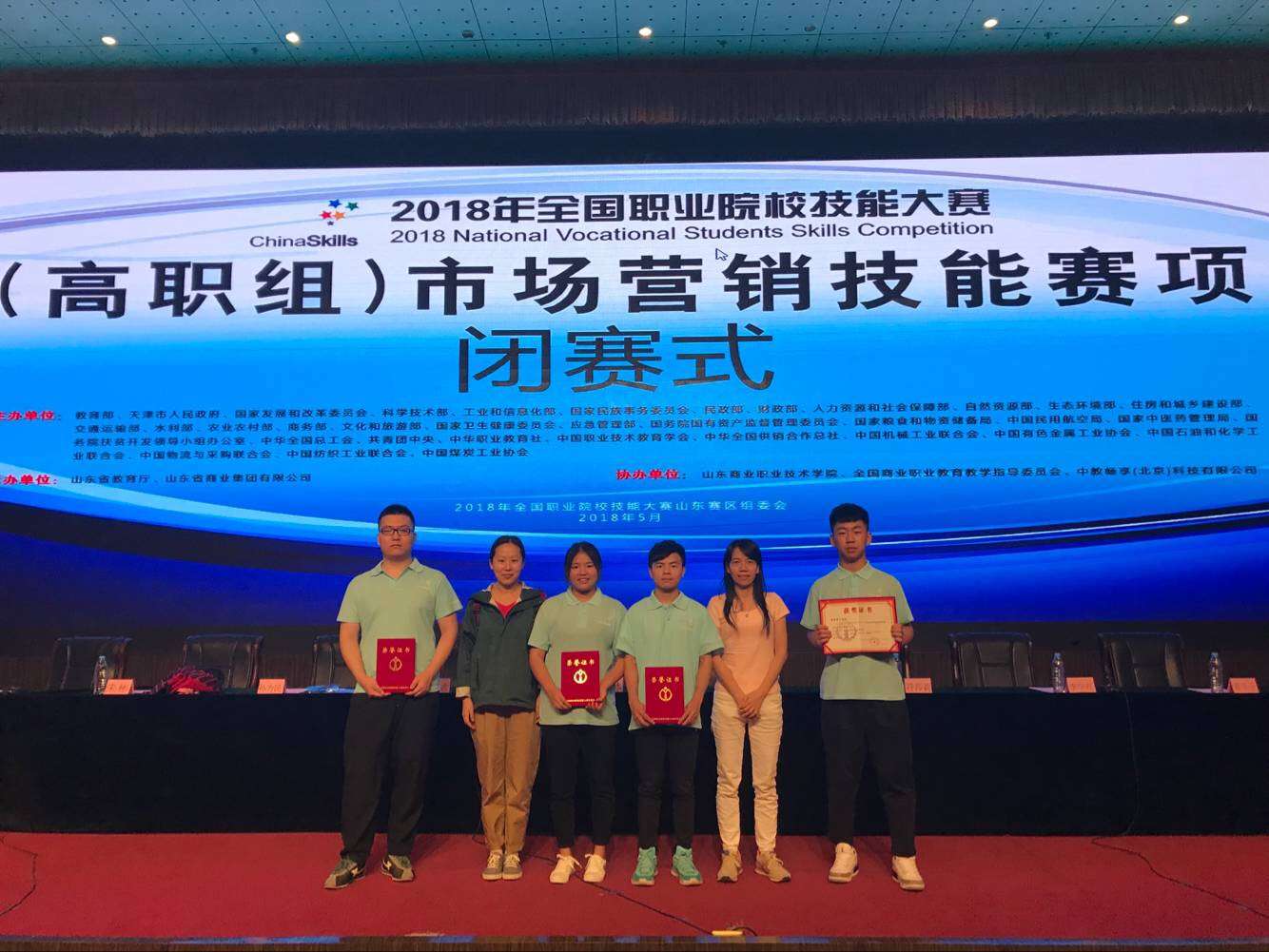 本院5月21日讯(工商管理学院报道) 2018年5月210日,全国职业院校技能大赛高职组市场营销赛项在山东商业职业技术学院开赛,来自全国84个代表队的336名选手进行了激烈角逐。海南经贸职业技术学院工商管理学院16市场营销1班许少文、16市场营销2班黄火全、陈健、16市场营销3班杨萍组成的参赛代表队获得“团体二等奖”。
